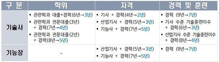 고용노동부가 청년층의 국가기술자격 취득 기회를 넓히기 위해 기술사 및 기능장 등급 시험 응시자격을 개선한다고 밝혔다. 올해부터 기술사·기능장 등급 시험 응시에 필요한 경력 기간을 현행 대비 2~4년 단축하여 더 많은 청년이 신속하게 상위 등급에 진입할 수 있도록 한다는 방침이다.현재 기술사·기능장 시험에 응시하려면 최대 9년의 경력이 필요해, 기술사 취득 평균 연령이 44.8세에 달하는 등 고령화가 심화하고 있