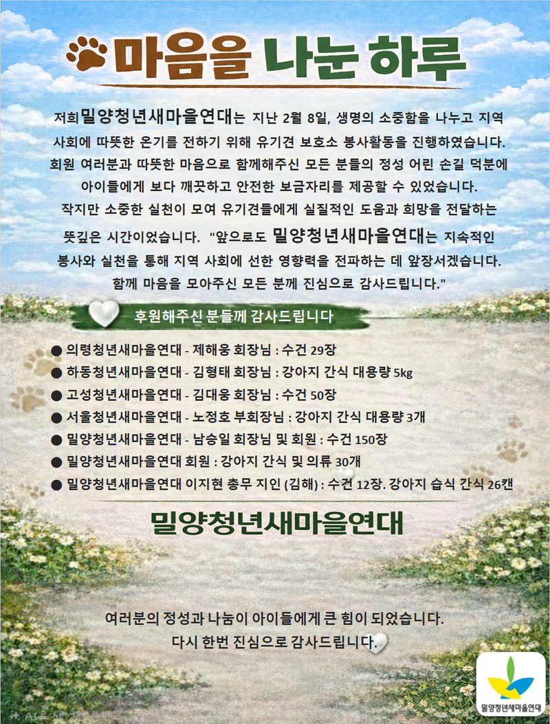 특히 이번 캠페인에는 밀양 지역뿐만 아니라 전국 청년새마을연대 네트워크가 십시일반 동참하여 그 의미를 더했다. ▲서울청년새마을연대(부회장 노정호)에서 강아지 간식 대용량 3개를 지원한 것을 비롯해, ▲의령청년새마을연대(회장 제해웅) 수건 29장 ▲하동청년새마을연대(회장 김형태) 강아지 간식 대용량 5kg ▲고성청년새마을연대(회장 김대웅) 수건 50장이 전달되었다.