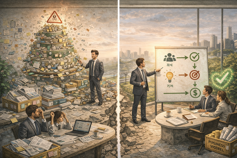 비즈니스 모델링까지 정리되면 기획은 어느 정도 완성된 것처럼 보인다. 구조와 흐름이 잡히고, 설명도 가능해진다. 그런데 이 시점에서 자주 생기는 문제는 모델이 점점 ‘좋아 보이기’ 시작한다는 점이다. 정리가 진행될수록 사람들은 더 많은 요소를 담으려 한다. 설명을 보완하고, 항목을 추가하고, 예외 상황까지 반영하다 보면, 처음에는 정리를 위해 시작한 작업이 어느새 지나치게 세분화된 작업으로 바뀐다. 그 결과 비즈니스 모델은 더 촘촘해지지만, 실행 가능성은 오히려 떨어진다.