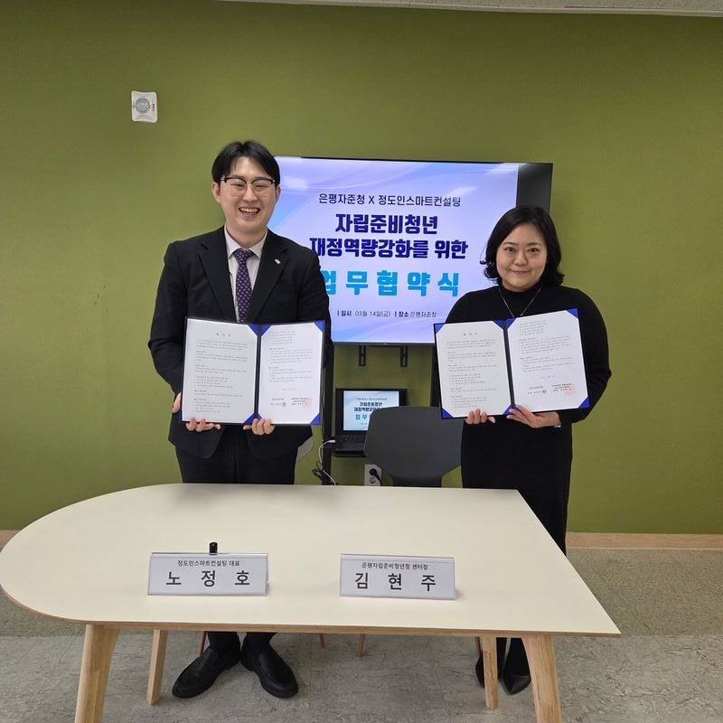 서울 은평구가 자립준비청년의 경제적 독립을 지원하기 위해 정도인스마트컨설팅(대표 노정호)과 은평자립준비청(센터장 김현주) 간 업무협약(MOU)을 체결했다.