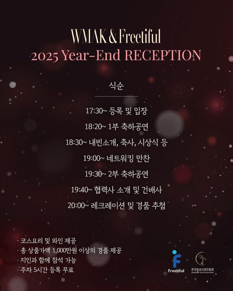 여성 사회자들의 역량 강화를 위해 활동하는 '한국여성사회자협회'와 프리랜서 아나운서 진행자 매칭 플랫폼 '프리티풀'이 공동으로 오는 11월 24일(월) 저녁, 서울 청담 리베라호텔 몽블랑홀에서 '2025 Year-End RECEPTION'를 개최한다고 밝혔다.