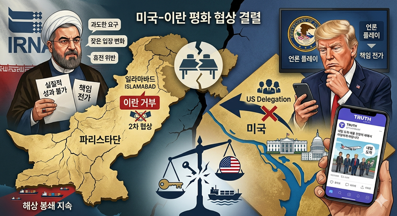 이란이 파키스탄에서 개최될 예정이었던 미국과의 2차 평화 협상 참여를 거부했다. 이란 국영 매체 IRNA 통신은 이날 이슬라마바드에서 2차 회담이 열릴 예정이라는 보도가 사실이 아니라고 밝혔다. 현 상황에서는 실질적인 성과를 거둘 가능성이 희박하다고 덧붙였다.