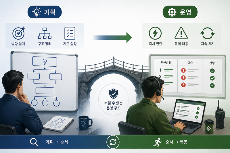 문제는 기획이 완성되었더라도, 운영 방식이 준비되어 있지 않은 경우가 많다는 데 있다. 현장에서 자주 보게 되는 상황은 이렇다. 실행 순서는 흐려지고, 역할은 있지만 책임은 분산되며, 기준은 있지만 판단은 늦어진다. 이 순간부터 기획은 유지되기 어렵다. 여기에 기획과 운영을 혼동하기 시작하면 문제는 더 커진다. 운영에서 터진 문제를 다시 기획으로 해결하려 하고, 기획의 기준을 현장에 그대로 적용하려 한다. 하지만 운영은 언제나 변수와 함께 움직인다. 그래서 필요한 것은 완벽한 기획이 아니라 버틸 수 있는 운영 구조다.